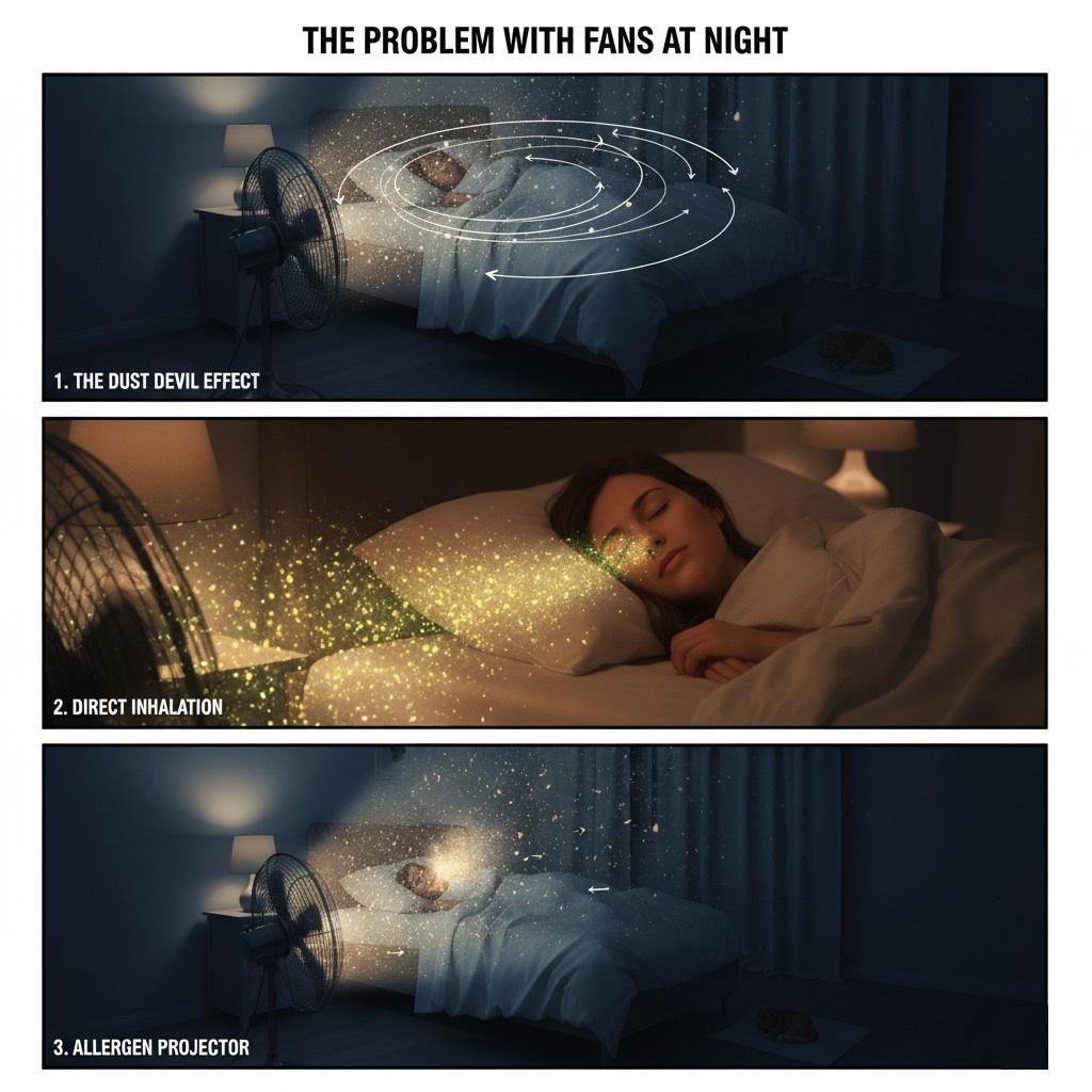 Nighttime allergies turn your bedroom into a battleground—stuffy nose, scratchy throat, watery eyes, and constant congestion. Ceiling fans and bedside fans make it worse by blowing allergens around and drying out your already irritated airways, leaving you exhausted and miserable.
